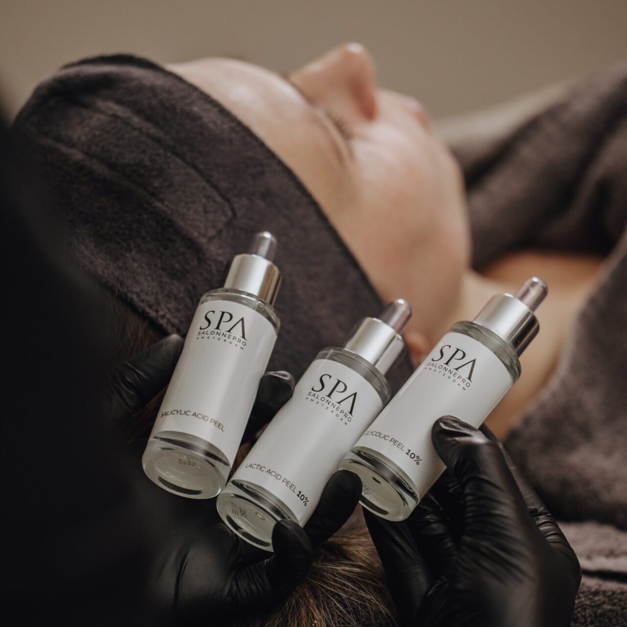 Er wordt gekozen uit de 4 soorten peelings: glycolzuur, salicylzuur, melkzuur of een combinatie van zuren (sensitive peel).